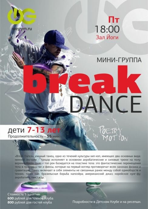 "Break Dance» уличный танец, одно из течений культуры хип-хоп, имеющее два основных вида: нижний экстрим – танцор исполняет в основном акробатические и силовые трюки на полу; верхний брейк-данс – топ рок базируется на пластике тела: это фантастические перемещения тела в пространстве и фиксы, которые на первый взгляд противоречат всем законам физики и гравитации. Танец включает в себя элементы не связанных ранее между собой единоборств и техник, таких как: бразильская борьба капоэйра; американский джаз; корейское кунг-фу; акробатика, твист и др.